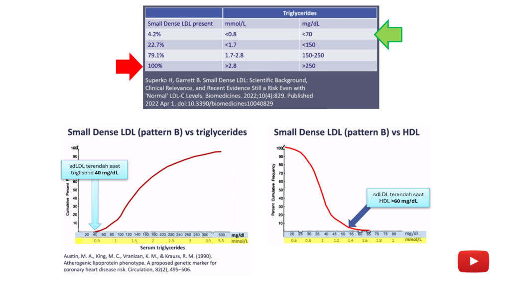 Keberadaan LDL dalam darah sepenuhnya normal, bahkan jika angkanya meroket pun gak papa, asal semua partikel LDL-nya normal, bukan partikel LDL yang rusak. Jika angka trigliserid diatas 250 mg/dL, bisa dipastikan seluruh partikel LDL-nya adalah jenis sdLDL, golongan yang sudah rusak. Keberadaan sdLDL paling rendah adalah dalam kondisi trigliserid kurang dari 70 mg/dL dan HDL lebih dari 60 mg/dL.