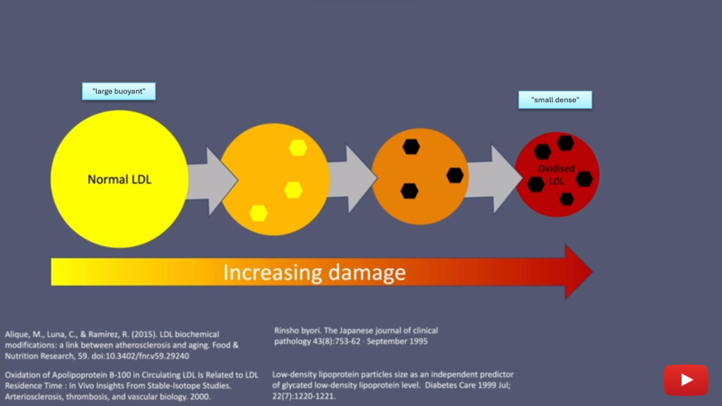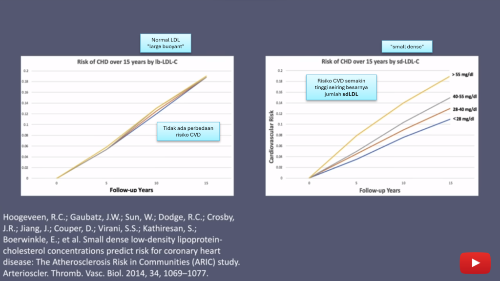 LDL yang sejatinya netral, memang bisa berubah menjadi jahat. Bentuk partikel LDL yang sehat dan normal adalah besar (disebut “large buoyant“, disingkat lbLDL). Namun karena teroksidasi menjadi rusak, kemudian bentuk partikelnya menjadi sangat menyusut dengan kepadatan yang sangat tinggi, istilahnya “small dense LDL” (disingkat sdLDL). Dalam sebuah penelitian panjang selama 15 tahun terpublikasi di tahun 2014, kesimpulannya sudah paten bahwa risiko penyakit kardiovaskular (hipertensi, serangan jantung, stroke, dsb) semakin tinggi seiring besarnya jumlah sdLDL. Sementara, jika jumlah LDL-nya dari jenis lbLDL (“large buoyant“), tidak ada perbedaan risiko penyakit kardiovaskular walaupun keberadaannya dalam jumlah besar maupun kecil.